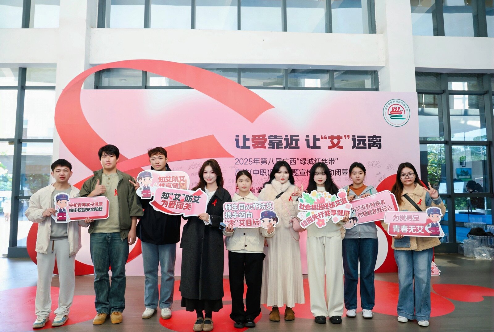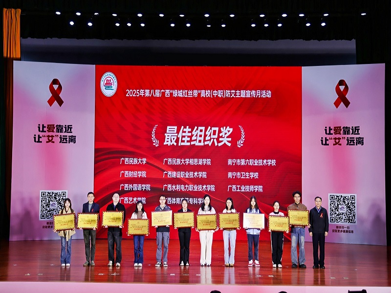 近日,由南宁市疾病预防控制中心主办的2025年第八届广西“绿城红丝带”高校(中职)防艾主题宣传月闭幕式暨表彰大会在南宁职业技术学院圆满落幕。我校学前教育专业学生邓司,用青春之声传递防艾正能量,在“为爱发声 青春无艾”校园歌手大赛中斩获冠军。在“知艾防艾 共享健康”防艾主题作品大赛中,两项平面组作品获优秀作品奖,四项视频组作品获优秀作品奖;在“知‘艾’防‘艾’,为爱闯关”高校艾滋病核心知识竞答挑战赛中获优秀奖;全校集体知识竞赛、问卷调查、直播观看等活动参与度排名均保持前列,获“最佳组织奖”(全区仅十所高校获此荣誉)。多项荣誉彰显我校在防艾宣传教育工作中的显著成效与育人成果。